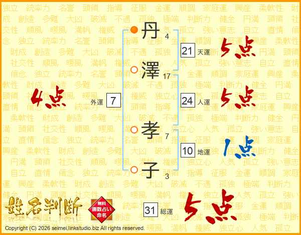 丹(4画)澤(17画) 孝(7画)子(3画)