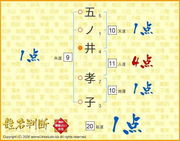 五(5画)ノ(1画)井(4画) 孝(7画)子(3画)