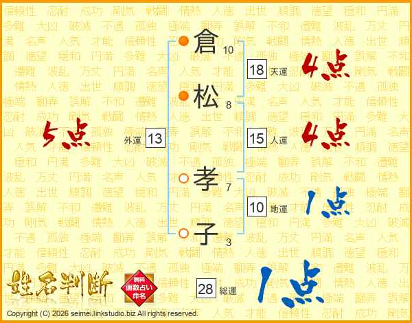 倉(10画)松(8画) 孝(7画)子(3画)