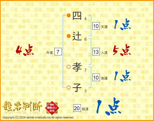 生活面を象徴する運勢です。外部から受ける影響力を表し、結婚運、家庭運や職場、環境への順応性を表します。総運から人運を引いた画数。姓や名が1文字の場合を除く。