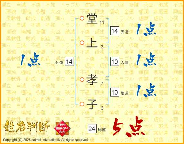 生活面を象徴する運勢です。外部から受ける影響力を表し、結婚運、家庭運や職場、環境への順応性を表します。総運から人運を引いた画数。姓や名が1文字の場合を除く。