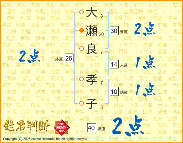 大(3画)瀬(20画)良(7画) 孝(7画)子(3画)