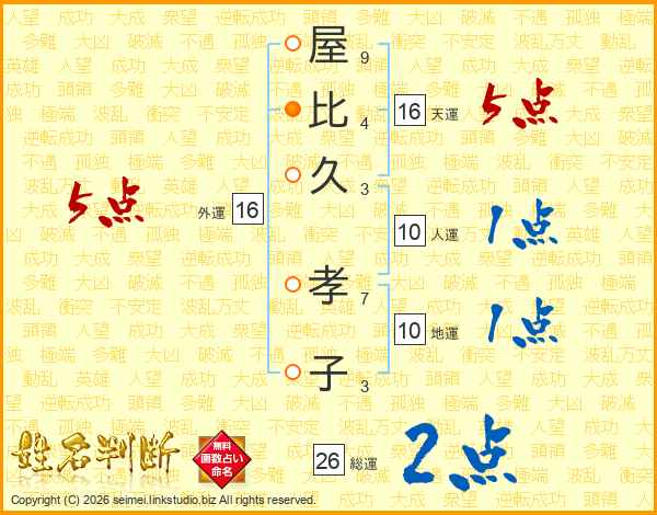 屋(9画)比(4画)久(3画) 孝(7画)子(3画)