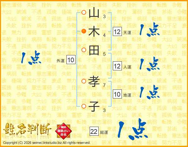 山(3画)木(4画)田(5画) 孝(7画)子(3画)