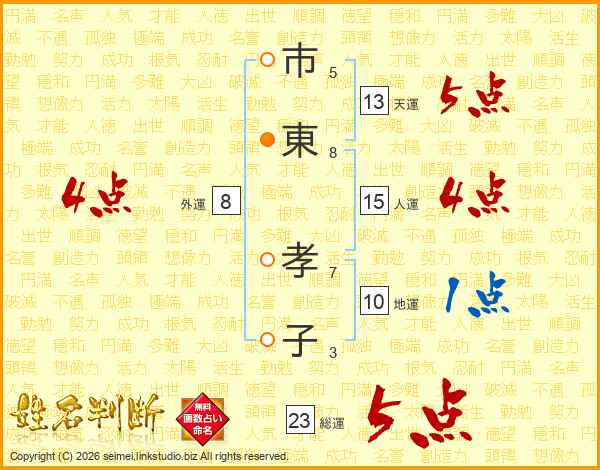 市(5画)東(8画) 孝(7画)子(3画)