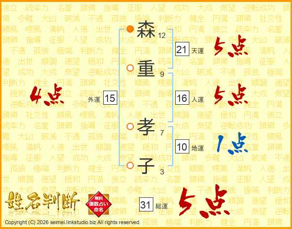 森(12画)重(9画) 孝(7画)子(3画)