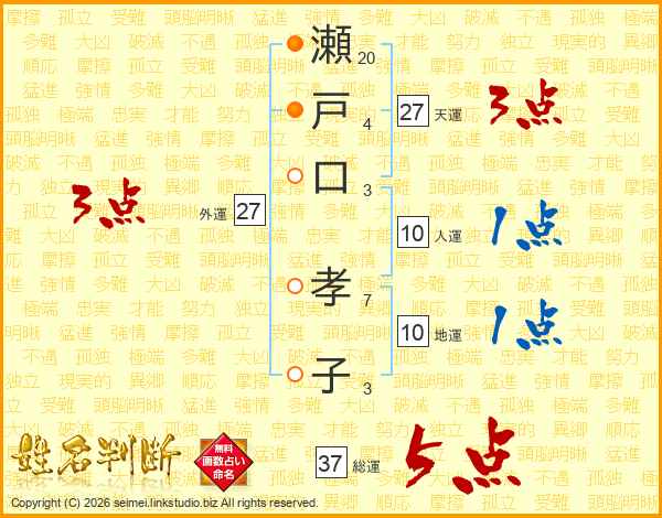 瀬(20画)戸(4画)口(3画) 孝(7画)子(3画)