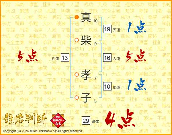 あなたの人生を表す1番重要な運勢です。生涯を通じて影響する総合運となり、主に50歳以降の晩年期に影響を及ぼします。苗字と名前の合計画数。