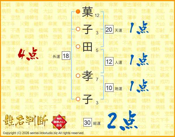 菓(12画)子(3画)田(5画) 孝(7画)子(3画)