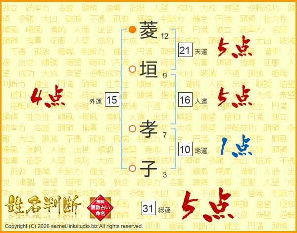 菱(12画)垣(9画) 孝(7画)子(3画)