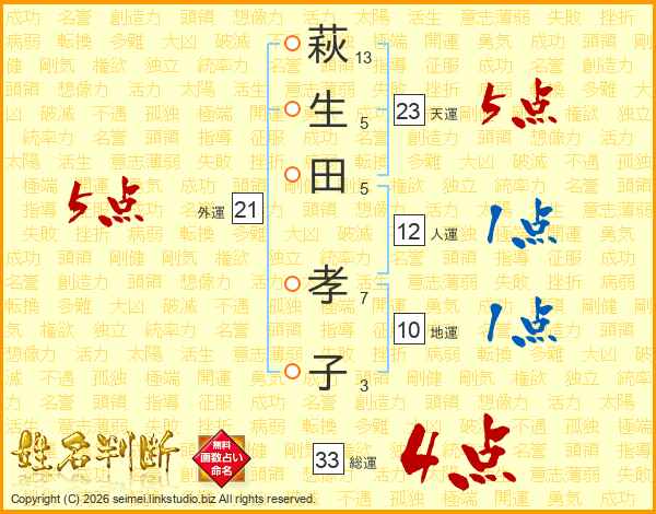 萩(13画)生(5画)田(5画) 孝(7画)子(3画)