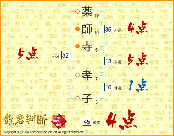 薬(19画)師(10画)寺(6画) 孝(7画)子(3画)