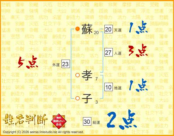 あなたの人生を表す1番重要な運勢です。生涯を通じて影響する総合運となり、主に50歳以降の晩年期に影響を及ぼします。苗字と名前の合計画数。