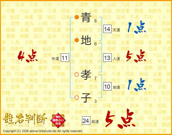 あなたの人生を表す1番重要な運勢です。生涯を通じて影響する総合運となり、主に50歳以降の晩年期に影響を及ぼします。苗字と名前の合計画数。