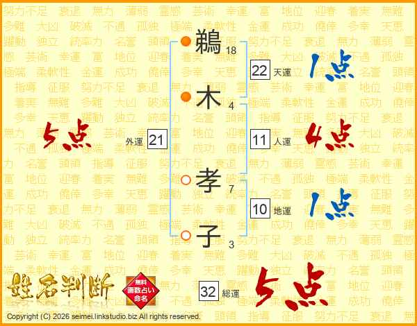 鵜(18画)木(4画) 孝(7画)子(3画)