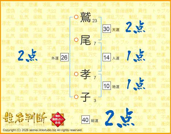 鷲(23画)尾(7画) 孝(7画)子(3画)