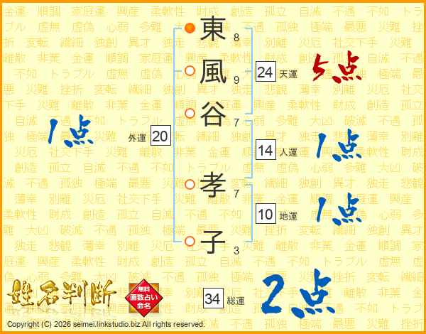 東(8画)風(9画)谷(7画) 孝(7画)子(3画)