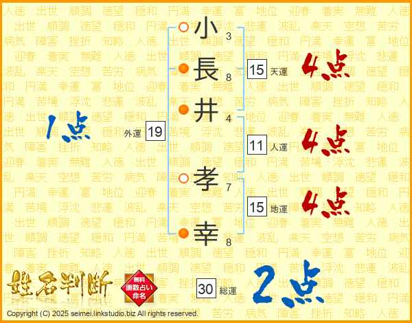 小(3画)長(8画)井(4画) 孝(7画)幸(8画)