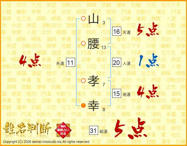山(3画)腰(13画) 孝(7画)幸(8画)