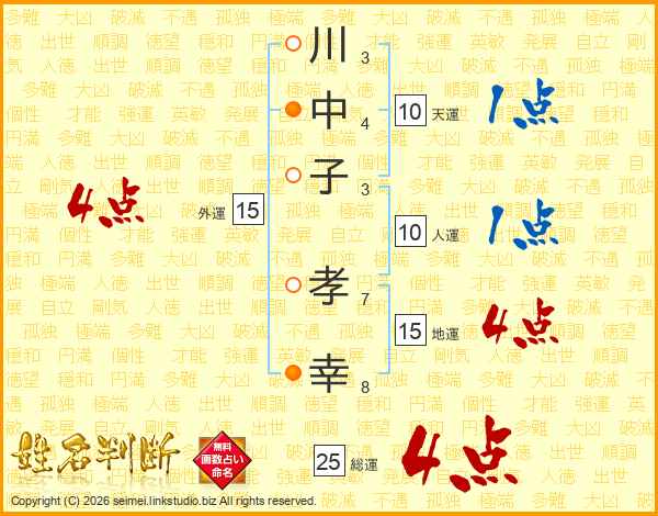 川(3画)中(4画)子(3画) 孝(7画)幸(8画)