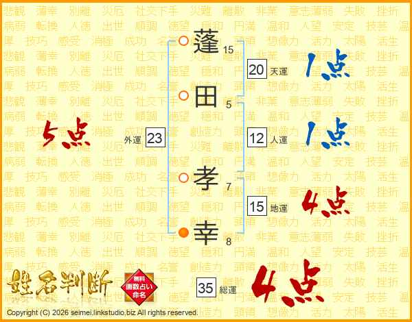 蓬(15画)田(5画) 孝(7画)幸(8画)
