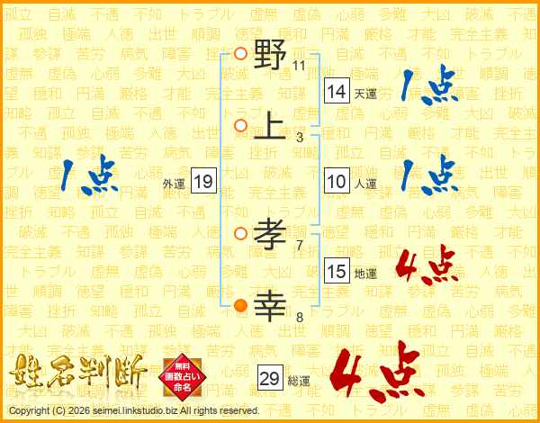 生活面を象徴する運勢です。外部から受ける影響力を表し、結婚運、家庭運や職場、環境への順応性を表します。総運から人運を引いた画数。姓や名が1文字の場合を除く。