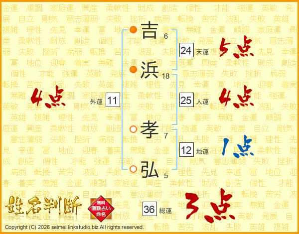吉(6画)浜(18画) 孝(7画)弘(5画)