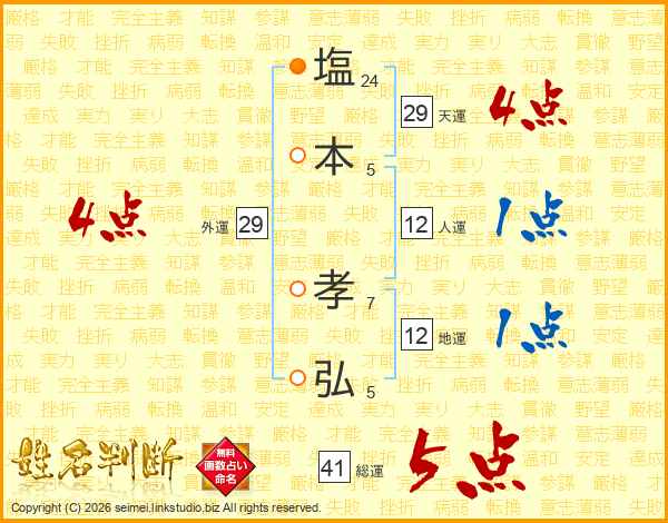 塩(24画)本(5画) 孝(7画)弘(5画)