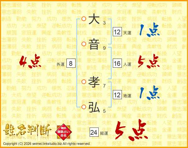あなたの人生を表す1番重要な運勢です。生涯を通じて影響する総合運となり、主に50歳以降の晩年期に影響を及ぼします。苗字と名前の合計画数。