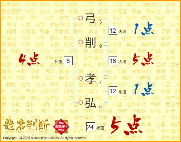 弓削孝弘さんの総運は24画の5点!