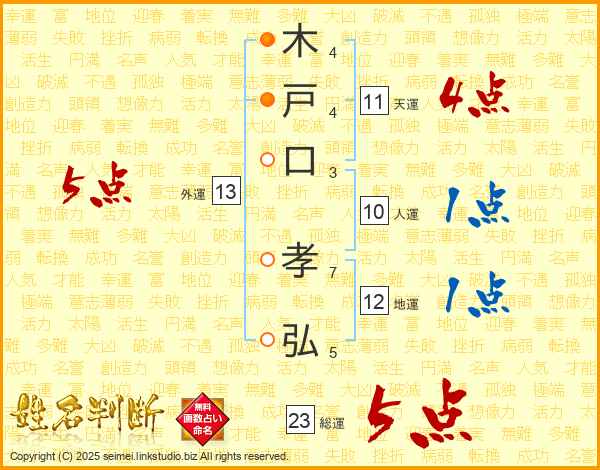 木(4画)戸(4画)口(3画) 孝(7画)弘(5画)