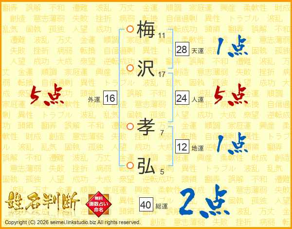 梅(11画)沢(17画) 孝(7画)弘(5画)