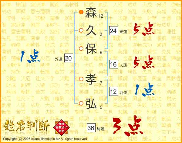 森(12画)久(3画)保(9画) 孝(7画)弘(5画)