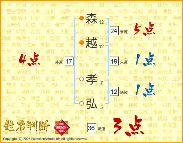 あなたの人生を表す1番重要な運勢です。生涯を通じて影響する総合運となり、主に50歳以降の晩年期に影響を及ぼします。苗字と名前の合計画数。