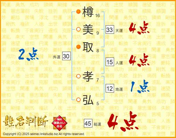 樽(16画)美(9画)取(8画) 孝(7画)弘(5画)