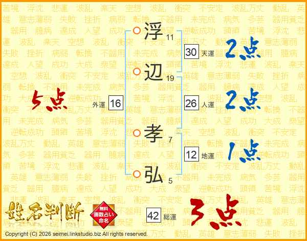 浮(11画)辺(19画) 孝(7画)弘(5画)