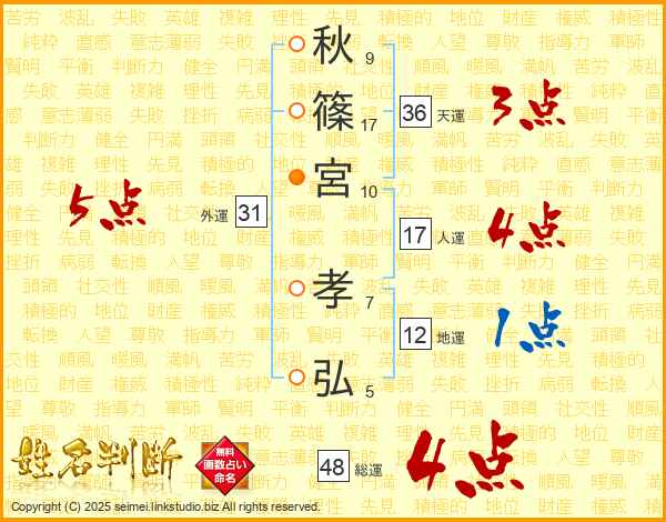 秋(9画)篠(17画)宮(10画) 孝(7画)弘(5画)