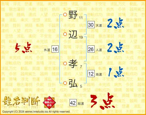 野辺孝弘さんの人運は26画の2点!