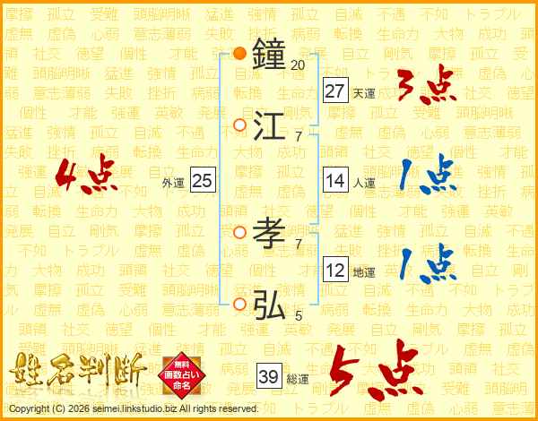 鐘江孝弘さんの総運は39画の5点!