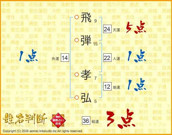 飛(9画)弾(15画) 孝(7画)弘(5画)