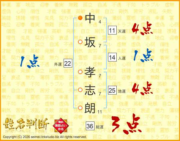 中(4画)坂(7画) 孝(7画)志(7画)朗(11画)