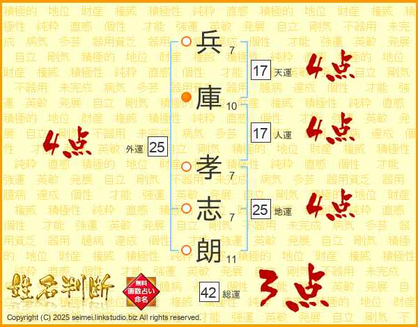 兵(7画)庫(10画) 孝(7画)志(7画)朗(11画)