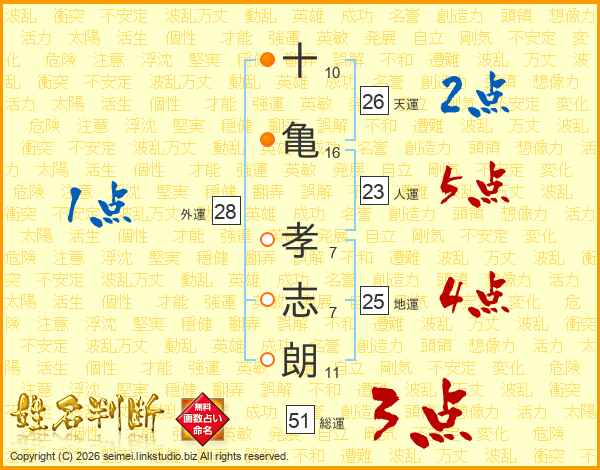 十(10画)亀(16画) 孝(7画)志(7画)朗(11画)