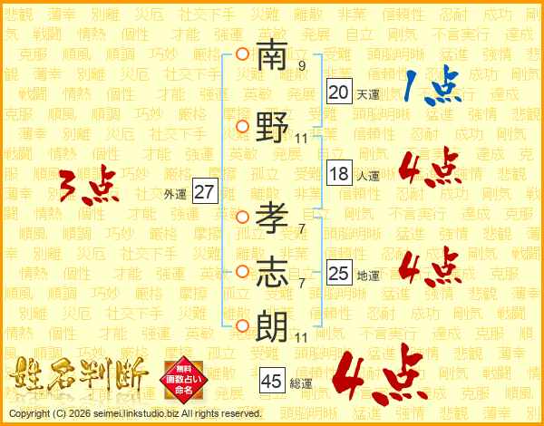 南(9画)野(11画) 孝(7画)志(7画)朗(11画)
