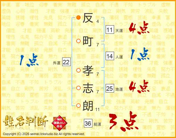 反(4画)町(7画) 孝(7画)志(7画)朗(11画)