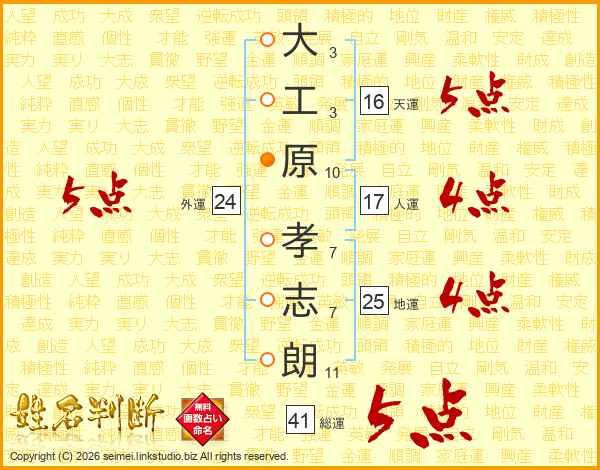大(3画)工(3画)原(10画) 孝(7画)志(7画)朗(11画)