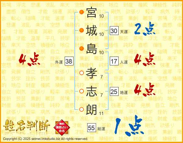 宮(10画)城(10画)島(10画) 孝(7画)志(7画)朗(11画)