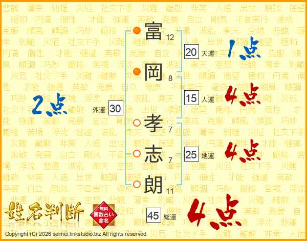 富(12画)岡(8画) 孝(7画)志(7画)朗(11画)