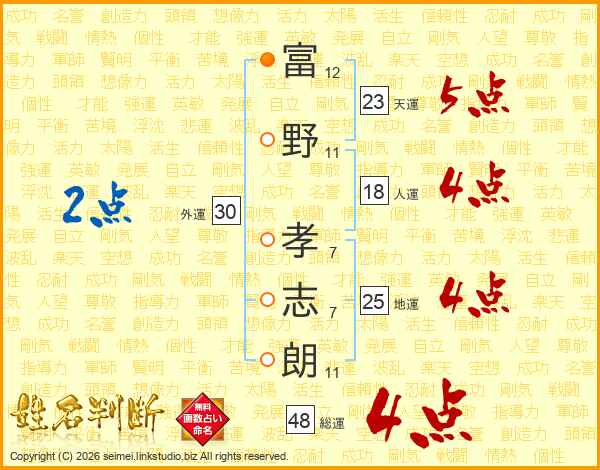 富(12画)野(11画) 孝(7画)志(7画)朗(11画)