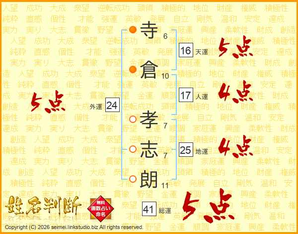 寺(6画)倉(10画) 孝(7画)志(7画)朗(11画)